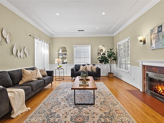Welcome to this charming 1935 traditional-style home in a very desirable North Monrovia neighborhood, just a block away from the North Encinitas Historic District. This sweet home boasts classic architectural details, including wood shutters, a painted brick chimney, and an elegant scalloped wood gableboard accent. Step up onto the cozy front porch and enter through the wood and multi-paned glass front door. The first thing you'll notice is the classic oak hardwood flooring that flows throughout. Double doors lead into a spacious living room adorned with a trey ceiling, crown molding, recessed lighting, built-in niches, wainscoting and a door with access to the rear yard. The fireplace with brick surround and wall sconces create a warm and inviting atmosphere. The formal dining room, featuring a chair rail, decorator chandelier, and convenient pass-through to the kitchen, is perfect for hosting dinner parties. The kitchen has granite countertops, a center island, ceiling fan, stone tile flooring, a double sink, and plenty of wood cabinetry. The primary bedroom is a private retreat with sliding doors to the rear balcony, a picture frame rail, a walk-in closet, and an attached ¾ bath featuring a wood vanity and a walk-in shower with travertine tile surround. The home offers two more comfortable bedrooms that share a full hallway bathroom complete with a shower/tub combo, wood vanity, and stone tile flooring. The expansive rear yard is an outdoor oasis with mature landscaping and a versatile converted shed with electrical wiring, ideal for outdoor gatherings. Additional amenities include original registers, central air & heat, hallway laundry, a two-car detached garage with easy access to plumbing and electrical, ample parking, and fruit trees. Situated in the sought-after Mayflower Elementary school district, this home is conveniently located near Old Town Monrovia, with its charming shops, coffee houses, banks, and restaurants. Don't miss the opportunity to own this darling piece of Monrovia!
