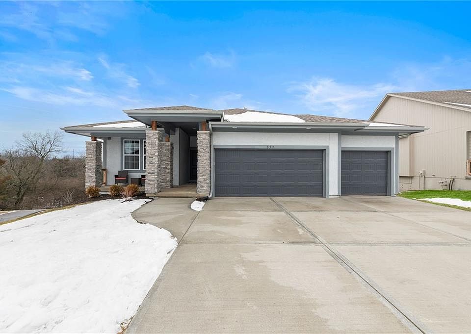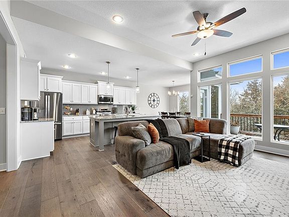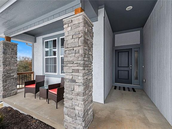 Ashland Reverse 1.5 Story on Walkout Basement in a Cul-de-sac, near Olathe West High School. Hardwood floors flow throughout the entry, great room, kitchen and dining room. Great room features a wall of windows with stone trimmed gas fireplace with TV mount above. The kitchen offers a large 4'x8' granite center island and abundant granite countertop space, stainless steel sink, custom painted cabinets, upgraded hardware, stainless appliances and large walk in pantry. Spacious Breakfast Room leads out onto the optimal sized deck. The spacious owner's suite with vaulted ceiling leads into a spa like bath with stunning granite double vanities, tile floors, separate jetted tub with tile surround and a large tiled walk in shower. A large walk-in closet connects to a convenient laundry room with built in lower cabinet with smooth top for folding with hanging rod above. The second main floor bedroom is a flex room that is currently setup as a nursery, it can be used for a home office, guest room, craft room or whatever your need might be. 2nd main floor bath is adjacent to this room and offers tile floors and a tub/shower. The switch back staircase leads down to the large rec room ideal for watching Chiefs football! The 3rd bedroom and separate bath with tile floor and shower complete the lower level finish. Tons of storage in the unfinished basement, plus it's stubbed for an additional bathroom and a wet bar. The unfinished storage area to left of stair landing also features a safe room under the front porch, just add a door! The 3 car garage is complete with openers and sprinkler controller for the irrigation system. Home backs to a treed greenspace which equals NO neighbors behind you! This is a lightly lived in 1 year young home!
