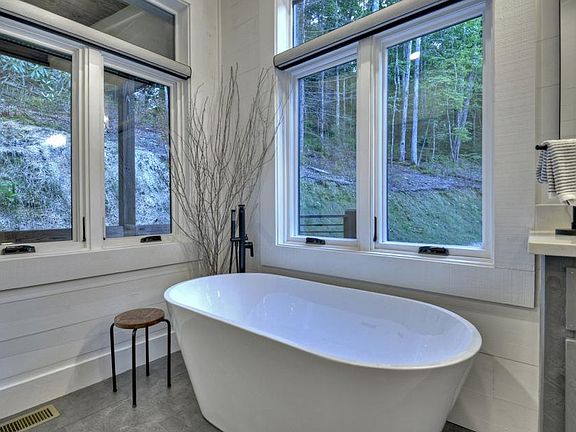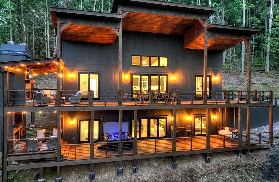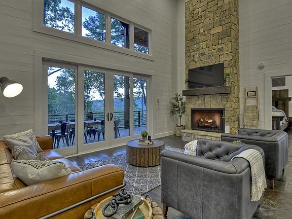 Refined Rustic Flair with Contemporary Lines & Modern Motif...this 4 bedroom/4 bath charmer is nestled on gentle 5 Acre private wooded lot surrounded by the mountains of the Aska Adventure Area with long range mountain views deeded Toccoa River access ...warm wood finishes with light & bright layout, plentiful wall to wall glass & soaring ceilings, industrial and distressed finishes with sleek stone fireplace, sliders open to expansive party porches with outdoor fireplaces & plenty of room to entertain and relax, two spacious masters on main feature ensuite "spa feel" baths with eye catching tile & upscale fixtures, stainless appliances & quartz countertops & backsplashes, modern lighting & beam work enhance the flow of the cozy but open floorpan, full finished terrace level offers guest quarters with with private baths, den/rec room, wet bar, storage galore, plentiful level parking, fabulous fire pit & trails, scenic pond & waterfall featureuniquely inviting & just off paved road close to historic downtown, lake & river...this is one you'll want to see! Great full time, much needed getaway, or perfect investment for vacation rental or corporate retreat with wildlife galore.