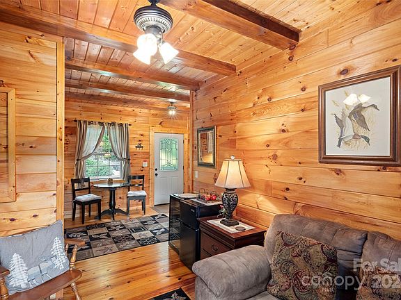 An authentic one bedroom log cabin with a Jacuzzi tub in the primary bedroom, separate shower/bathroom, TV, fireplace, full kitchen, private car parking, perfect for that romantic weekend, honeymoon or anniversary. You won't want to leave this one! Sit for a while on your front porch overlooking the lodge's private gardens and woodlands with the views over Cane Creek mountain. The bedroom has large corner Jacuzzi bath. There is a fully fitted kitchen, living room, cable TV, electric fire place, heat/air wall unit and bath/shower room. Close to Lake Lure, Chimney Rock Town Marina, Flowering Bridge, Shops, Restaurants and Park! Minutes from grocery store.