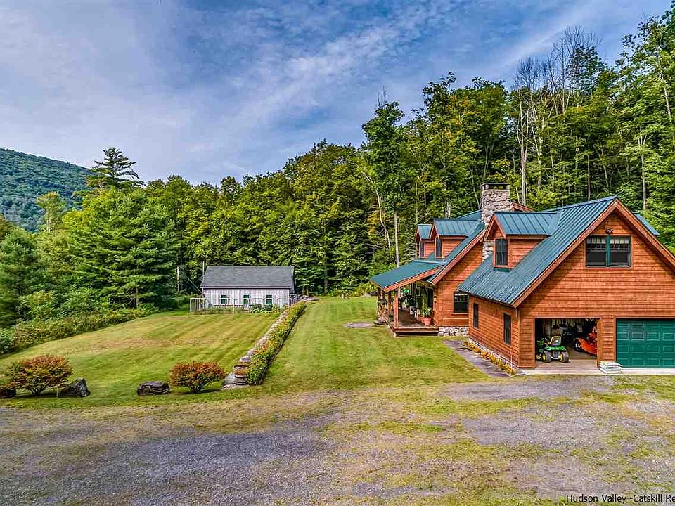 A sportsman's and hobbyist's paradise. Totally private, with acres and acres of state land both in front and behind it, and the constant sound of a rushing stream, this solid-as-a-rock, built with huge Canadian timber beckons lovers of the great outdoors and seekers of seclusion. Yet, it is minutes into Phoenicia and close to skiing, but you can have your own personal hiking kingdom. Meticulously maintained by the current owner, a multi-hobbyist himself, it features a high-ceilinged basement great for storage or as a workshop. (Ask about a "secret" room that can also serve as a wine cellar.) If it's a major workspace you want, a separate garage-type building with electric can host any number of hobbies; and the garage, attached to the house, has plenty to room to tinker with mechanics and vehicles, as the current owner does. And grow your own veggies in a separate garden, home to the biggest and most beautiful tomatoes you've ever seen. The carved bear you see in the living room was carved from a big tree on the property, adding to the rustic feel of the property; and the house itself is laid out to afford privacy for each bedroom. A turn-key purchase -- and a treasure. (Closing is contingent on seller finding suitable accomodation but seller is actively looking.]