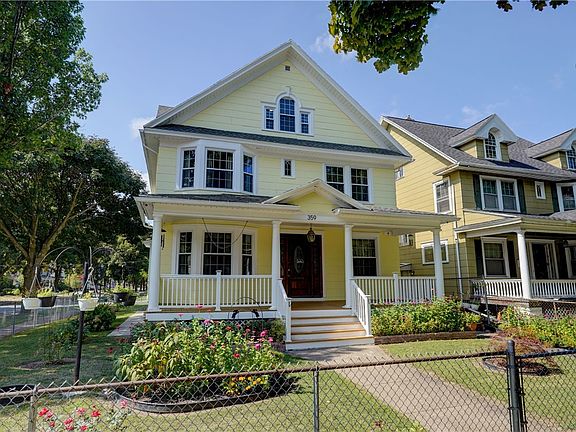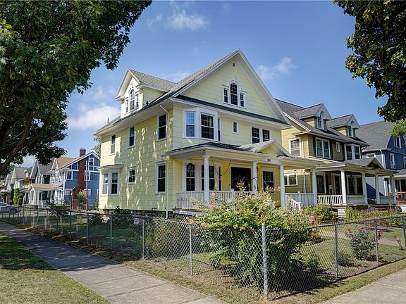 Step into your completely remodeled 4 bedroom 2 full bath home in the Historic Preservation District, Sibley Tract, in the heart of the 19th ward! Over 2,000 SF of top notch improvements! Beautiful hardwood flooring! Eat-in kitchen with ample cabinetry and all appliances included! Thermal windows and custom window treatments throughout! Large, light, bright living room, dining room with coffered ceiling and custom window seat! First floor office, computer room or nursery! Four large bedrooms - one with a balcony and awning off the rear of the home, and nicely finished bathrooms! Very high and dry basement with glass block windows! Third floor (another 1000 SF not included in the 2138 SF) is finished w/cathedral ceiling - and large room roughed in for a full bath! Sit on your huge front porch and enjoy the beautiful, lush lot surrounded by incredible gardens and fruit trees (apple, plum, persimmon and bearing grape vines). Street lamps and sidewalks for evening strolls! Newer tear off roof, high efficiency furnace, C/A and tankless water heater! Nothing to do in this well maintained home - inside or out - but move in and enjoy! Close to hospitals, colleges and parks! Eligible for the U of R/Strong grant closing costs as well as for tax credits for renovations as it is part of the National Register of Historic Places! Don't miss this one! Only permits on file will be supplied by seller. Please watch the video. All offers are due 9/26/2025 at 3:00.