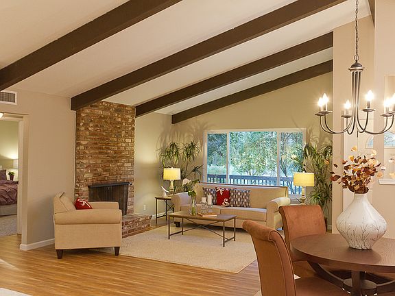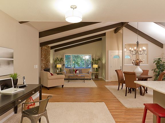 This charmer has new Pergo flooring in all the entertainment areas and new carpet in the bedrooms, large updated kitchen with can lighting, granite, tile back splash, and new stainless appliances. Bathrooms are revamped as well, with new vanities, fixtures, lighting and beautiful tile work. The exposed beams run the length of this lovely living space with updated lighting and two tone paint. To finish off this super polished abode, there are all new dual pane windows!