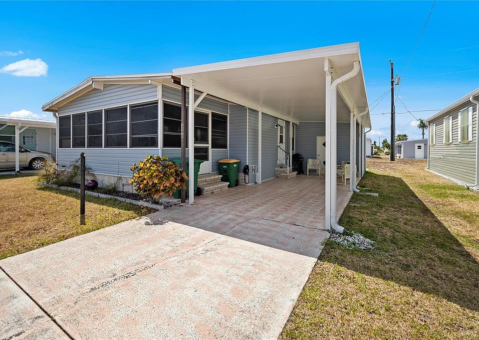 Welcome to the vibrant 55+ community of Vizcaya Lakes, ideally situated near Riverwood, the Myakka River, and El Jobean. This double-wide manufactured home, set on its own lot, features a new roof and gutters, with the A/C updated in 2018. No land lease fees for this home and low quarterly HOA cost. Vizcaya Lakes is a pet-friendly community offering resort-style living. Residents enjoy a spacious clubhouse, heated pool, spa, shuffleboard, shoreline fishing, pickleball, and numerous social events. Golf cart rides add to the charm of this retirement community. The home includes a delightful 200 sq. ft. Florida Room with vinyl windows, which can be easily converted into an additional air-conditioned space. The second bathroom has been modified to a half bath to accommodate an indoor washer and dryer; however, it can be reverted to a full bath by relocating the washer and dryer to the utility shed. The surrounding area offers year-round activities, such as fishing and boating on the Myakka River, golfing, exploring nature trails, and visiting the Charlotte Sports Park. Enjoy dining, shopping, and the pristine Gulf of Mexico beaches at Boca Grande, Englewood, Venice, Sarasota, and Sanibel Island. Experience affordable living with extensive community amenities in beautiful Southwest Florida, where life is full of wonder and enjoyment.