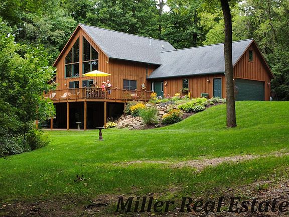 Outdoor Enthusiasts Dream! No matter your outdoor interests, whether it be a hike through the groomed trails, cross country skiing or hunting this property offers it ALL! See Video!! This 49 +/- Acres is the perfect mix of hardwoods, food plots, rolling terrain & wetlands. Ducks, geese & swans frequent the ponds & wetlands. Deer & turkey are abundant. Tree stands & deer shacks are included in the sale. This cedar sided 2 story is a perfect match to this 49 +/- acres. As you enter the home you are greeted with the foyer & mudroom leading you to the expansive great room with 26' high vaulted tongue & groove ceiling & stunning wall of windows. The kitchen features an island with breakfast bar, wood floors, dual ovens & is open to the dining & living area. Owner's Suite features walk-in closet full bath with jet tub & separate shower. Also, located on the main floor is a 1/2 bath & main floor laundry. The 2nd floor features 2 bedrooms, a 2nd full bath & a terrific walk-in attic closet (perfect as a bonus room as there are outlets & lighting or easy access storage). In the walk-out lower level you will find a large family room with knotty pine tongue & groove giving you more woodsy feel. An additional office/4th bedroom & plumbing available for a future 3rd full bath. 2 additional unfinished spaces to make your own or use for storage. This home offers an economical wood boiler for heat or you may choose to use the propane furnace. Oversized 2 car garage is attached to the home & an additional 30x48 pole barn with a 12x27 cabin are located on the property. The small cabin area attached to the pole barn is quaint, cute & perfect for deer camp, ski camp or just a cool getaway (See Video). As promised this is every outdoor enthusiasts dream home to be enjoyed on the expansive deck having an early morning coffee listening to the birds & wildlife - OR - grill out on the covered deck enjoying a quiet weekend at home. A less then 1 mile drive on the dirt road leads you to paradise.