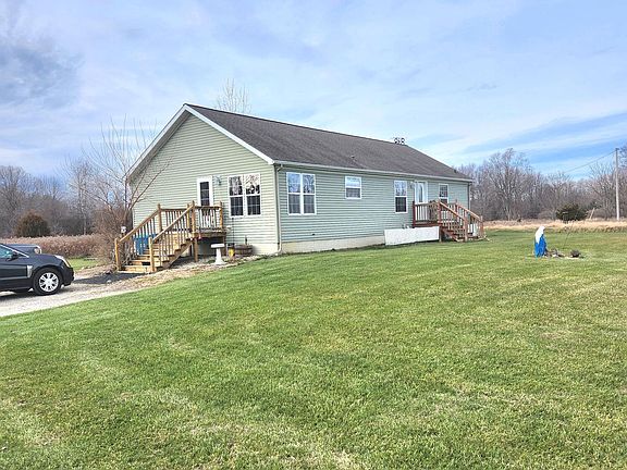 Discover this one-of-a-kind home, perfectly situated on a stunning 5.7-acre wooded lot, where you can enjoy the beauty of nature and the wildlife around you—what a rare gem! This home also comes with a Generac and water softening system!! The inviting living room boasts a cozy wood fireplace and large windows that frame stunning views of the expansive yard. Step outside onto the 12' x 16' deck, accessible from entry doors in the living area, perfect for outdoor enjoying or entertaining. The kitchen is thoughtfully designed with two dining areasone cozy nook and a more formal spacemaking mealtime gatherings a pleasure.