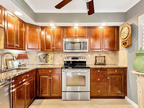 Discover the epitome of refined living here in this meticulously renovated 849 sqft 1 bed/1.5 bath condo w/washer dryer. This freshly painted gem, thoughtfully designed by an interior specialist, boasts a magnificent kitchen featuring tumbled marble backsplash, granite counters, solid cherry cabinets & timeless charm of plantation shutters. Your private lanai provides a tranquil retreat, while 2 walk-in closets offer ample storage space. This community offers a wealth of amenities, & a low HOA covers it all including water, cable & internet Embrace an enriching social scene w/weekly events in the clubhouse, featuring seminars, dances, games, & bingo.