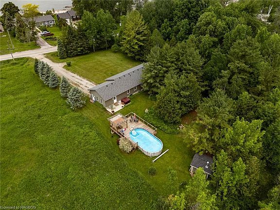 Escape city life and immerse yourself in tranquility with this charming bungalow on East Bayshore Road, just a five-minute drive from Owen Sound. Enjoy stunning water views and an amazing location with Hibou Beach and conservation areas only two minutes away. The property, just under an acre and surrounded by trees, offers over 2100 sq ft of finished living space ideal for main floor living. Features include a large kitchen, a spacious primary bedroom with an updated bathroom, and a full basement with an additional rec room, bedroom, and bathroom for extra space. Enjoy your morning coffee on the covered porch off the main floor living area. Recent upgrades include a new roof and siding. Outside, the property boasts a 16 x 32 heated above-ground pool with a large deck and pergola, perfect for entertaining, plus a hot tub. Experience peaceful privacy with close proximity to Hibou Beach and trails nearby as you create lasting memories in this picturesque home!