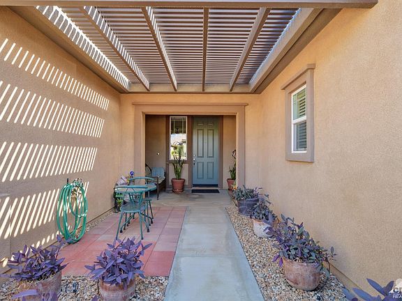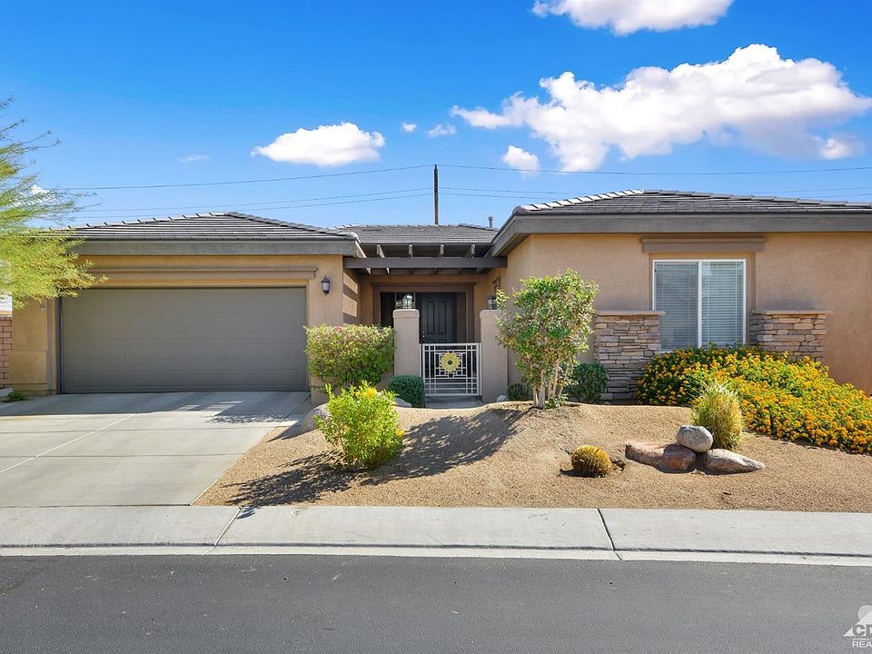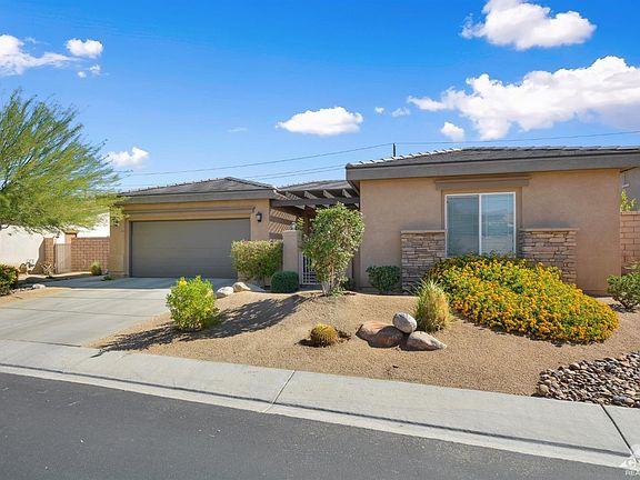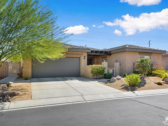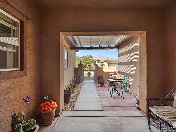 Welcome to The Gallery, one of Palm Deserts most desirable gated communities, for it's low Hoa fees, freeway access, proximity to shopping, casino, dining, medical facilities, & community college. This well maintained Solar home features 9' volume ceilings, 3 generous sized bedrooms, 2.5 baths, large great room with a gas log fireplace, & large windows which allows for an abundance of sunlight. The kitchen features granite counter tops, upgraded cabinetry, with task lighting, stainless steel appliances, breakfast bar & dining area. Enjoy watching the sunrise from the well manicured backyard with low maintenance desert landscaping. The covered patio spans the entire back of the home, to include an aluma-wood extension for a larger entertaining area. Built-in BBQ with concrete island for seating, gas fire pit, & an above ground spa with a latticed pergola. Other features include ceiling fans throughout, tankless water heater & additional storage in the over sized 2 car garage & Solar.