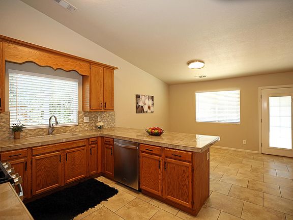 The kitchen features oak cabinetry, tile counters, stainless appliances, and a breakfast bar that opens to the dining area. The master suite includes a walk-in closet, backyard access, and a stunning remodeled bath with designer tile shower and beautiful vanity.