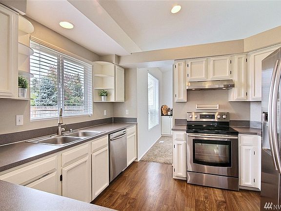 Open design, updated & immaculate! Beautiful stainless steel kitchen fully open to spacious family rm w/cozy fireplace. Vaulted ceiling dining & living rooms w/delightful bay window. Sizable master w/5' wide shower & large walk-in closet. Upgrades: white millwork/6 panel doors, new windows & water heater, 3 year old roof, updated kitchen & baths, designer lighting & more! Level/fully fenced backyard w/entertainment size deck + firepit. Quiet neighborhood yet close to I-5 & SR-18. Move-in ready!