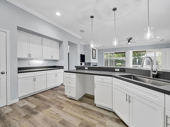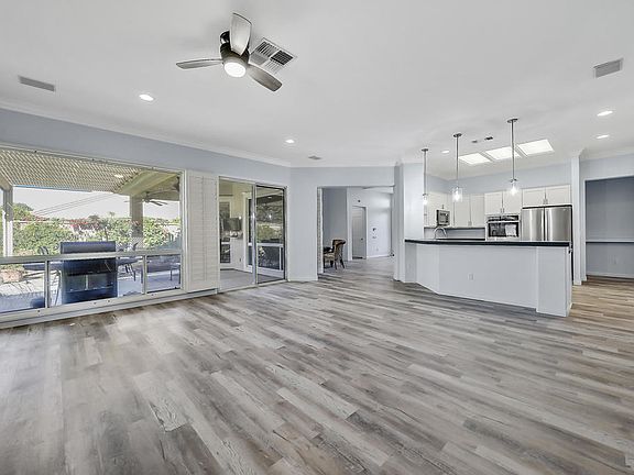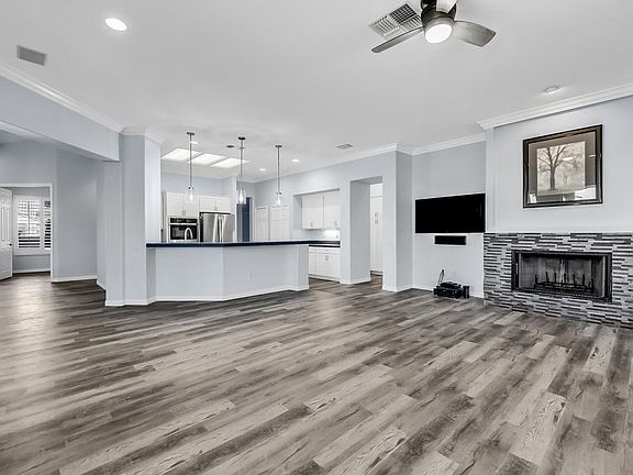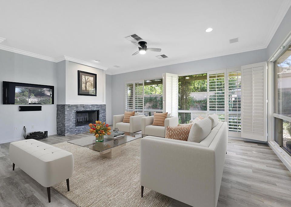 Come and see this stunning home! The home is located on a corner lot inside of Sun City and has over $100,000 worth of upgrades! You will not be disappointed when you step inside this beautiful SAN REMO model home. Once you walk in you will notice the high ceilings and the wall of windows that overlook the back patio and the two split living rooms (or formal dining area), yet still giving you an open plan and feel. With brand-new kitchen cabinets, appliances, pendent lighting, sink, and fixtures, you will love the modern look. Some other notable upgrades include a tiled fireplace, wood shutters, new flooring, and carpet throughout, including both bathrooms that have all new cabinets and countertops along with a fresh coat of paint throughout the home. On one side of the home, the large primary retreat has a brand-new tiled walk-in shower, large soaker tub, and an enormous walk-in closet! In addition, enjoy the beautiful bay windows overlooking the back patio. On the other side of the home, you'll find the two guest bedrooms really providing privacy away the homeowner's primary retreat. Another added bonus is the DEN, located just off the front entry overlooking the front courtyard. Outside you'll find that the extended covered back patio is completely walled in and it's like your own oasis! The yard is practically maintenance free with the exquisitely designed desert scape that wraps the corner. This home is perfect for entertaining with family and friends. New dishwasher OTW