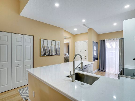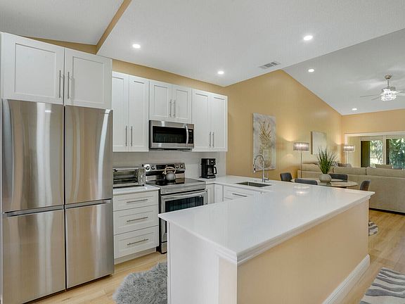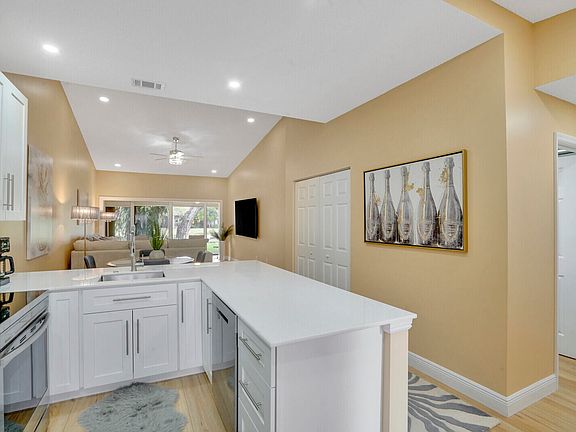 Beautiful lakefront villa, completely remodeled top to bottom in May 2022. This immaculate villa features upgraded finishes throughout. The kitchen has been opened to the living areas and features a large marble top island, matching marble tops and backsplash, solid wood white shaker cabinets, full extension solid wood drawers and updated appliances including a combination stove and air fryer. Updated lighting throughout with LED high-hats. Waterproof laminate flooring throughout with new baseboards, extending into the Florida room, both bedrooms and bathrooms. Newer combination washer/dryer. Fully furnished, with higher-end furniture and adjustable beds. Sold Turnkey with linens, dishes, etc. Hurry! Priced to sell.