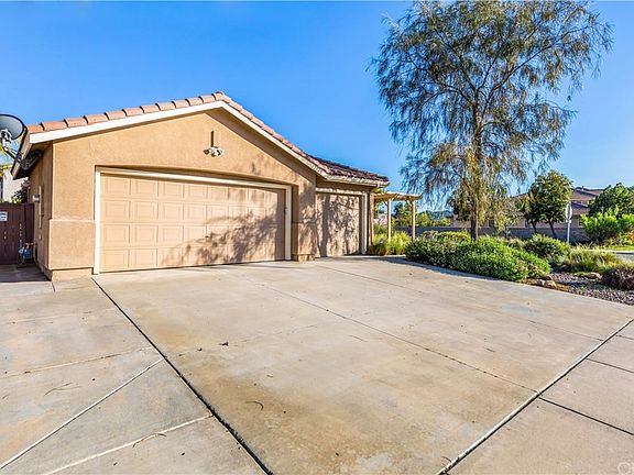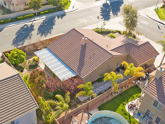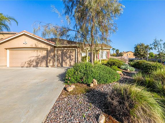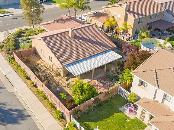 Enchanting single story on a corner lot close to Bear Creek Golf Club, shopping, dining, the 15 Freeway and more! A trellis of flowering wisteria frames the home's entry, where a meticulously-maintained open concept floor plan with vaulted ceilings unfolds. Bright hardwood and neutral colors create a sleek and seamless feel to the living room. The spacious kitchen features nearly-new stainless refrigerator/freezer and oven/stove, a prep island with bar top seating and bountiful counter space and storage. The family room, with its fireplace and media nook, is an extension of the kitchen and becomes the ideal gathering point for this home's functional and versatile layout. The master bedroom with its en suite bathroom enjoys dual sink vanities, a soaking tub/stand up shower combo and a large walk-in closet. Down the hallway, 2 additional bedrooms enjoy relative privacy and a sense of seclusion while being under the same roof. Here you'll find another dual sink vanity bathroom with a shower/tub combo. The whimsical rear grounds of the home are reminiscent of an English garden, with stone walking paths, a babbling fountain, numerous producing fruit trees (Orange, and raised gardening boxes for cultivating your own vegetables. Escape the heat of the day under the refreshing canopy of your extensive, Alumawood patio cover. Completed by a 3-car garage, this 1,581 sq.ft. single story is in a league all its own.