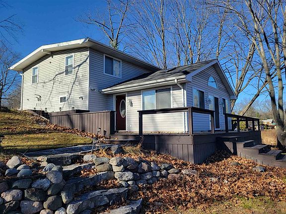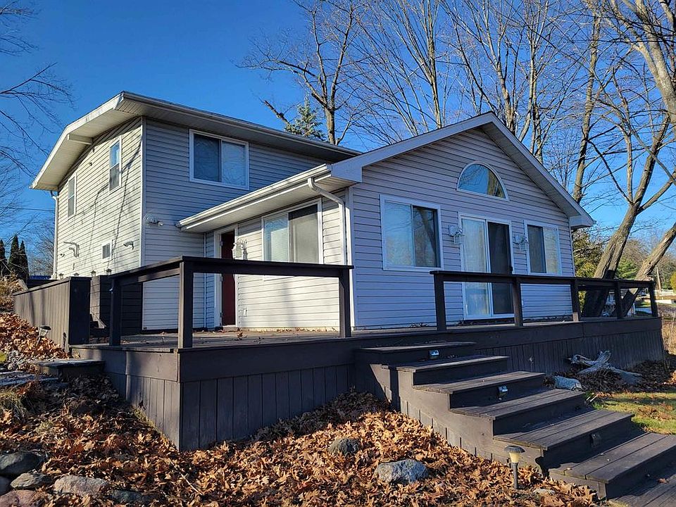 82' of Wixom Lake waterfront. Enjoy a stunning view and be ready for lake life when the water is restored. This is the one you've been waiting for! A move-in ready home or cottage that is ready for you to kick back and relax at. Located on a gravel road along the shores of all sports Wixom Lake. The extensive decking has easy steps to tiered level areas leading you to the waters edge. Flagstone steps take you to the firepit where many fun evenings will surely take place. The steel retaining wall creates another level area and there is a wood seawall with a dock. The road side yard is roomy and offers plenty of room for games with a view of the lake. Enter the house into the large, light and bright living room that steps out to the deck. Laminate wood flooring throughout the living room dining room & sitting room. Tiled floors in the kitchen. The kitchen is well equipped to handle all your cooking needs and the appliances are included. Big dining space for evening board games or a perfect work from home area. Quiet bonus room nook near the wood burning fireplace (fp not currently operable). This level also has a full bath & large utility room offering storage space & washer & dryer hook up. Upstairs you'll find a family room so everyone has space to relax and gather. 3 roomy bedrooms on this level along with a half bath! 1.5 car detached garage for all your storage needs. Close to state land, trails and convenience stores.