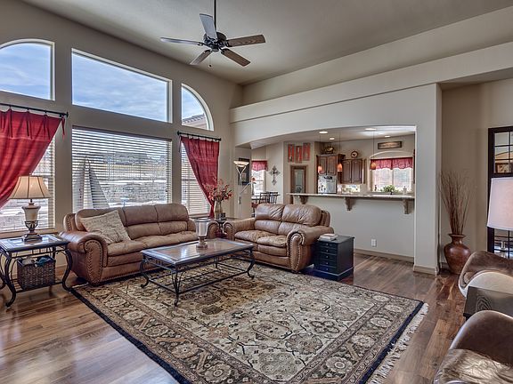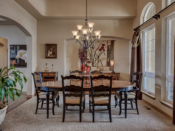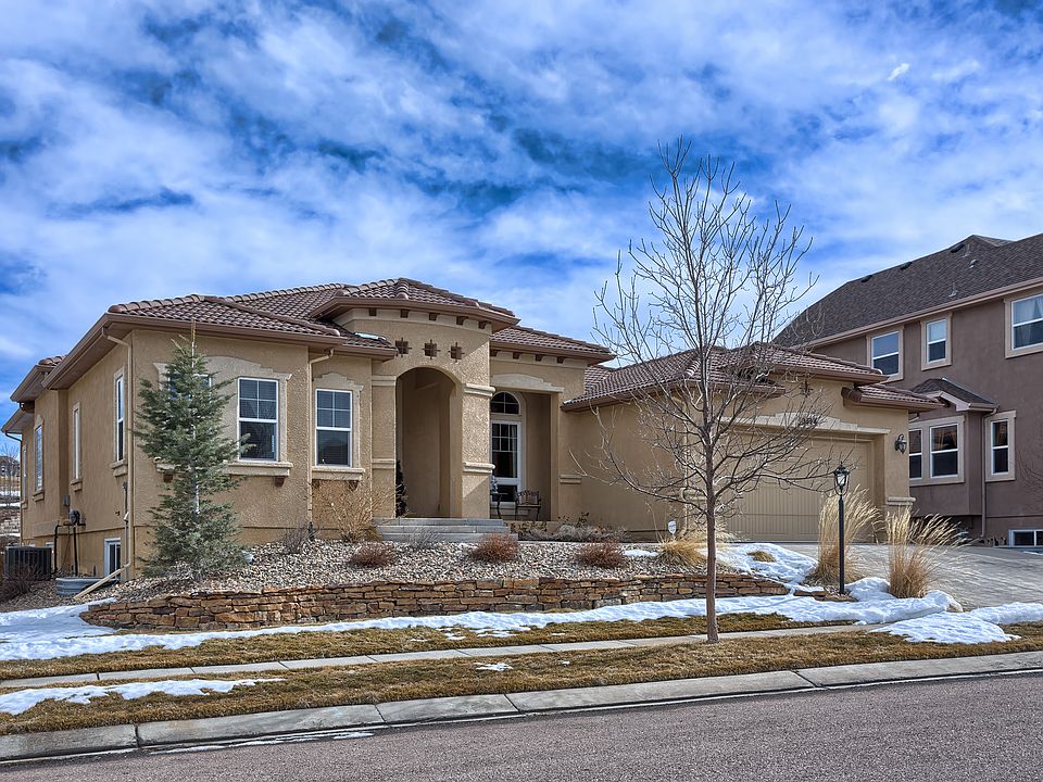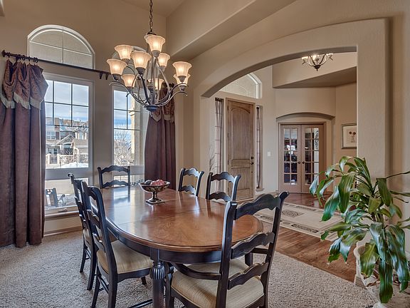 Beautifully maintained ranch style home in School District 20, boasts 4 bedrooms, 4 bathrooms, 3 car tandem garage & over 5,000 square feet. Offering true main level living and open floor plan, this home features 12 foot ceilings, extensive walnut wood flooring & stunning floor to ceiling windows. Perfect for entertaining, the gourmet kitchen boasts granite counters, ample cabinets, double ovens, gas stove, sprawling island, pantry, adjoining breakfast nook & Butler’s Pantry. The spacious living room features a cozy gas fireplace. Unwind in the master retreat complete with serene reading area, walk-out to patio, adjoining 5 piece bath providing custom tile shower, double vanity & jetted tub. The elegantly appointed formal dining room, generous sized study, powder room and laundry/mud room complete the main level. The stunning lower level features 9 foot ceilings, a sprawling family room with billiards & gaming area, and adjoining wet bar. Three spacious secondary bedrooms, one with on suite full bathroom, offer large closets. Enjoy summer evenings on the flag stone back patio, overlooking the professionally landscaped yard. Enjoy park side living while backing to a private Pine Creek neighborhood park featuring Pirates Cove Splash Park. This spectacular location offers Front Range views, convenient access to shopping, dining, golfing, and I-25.
