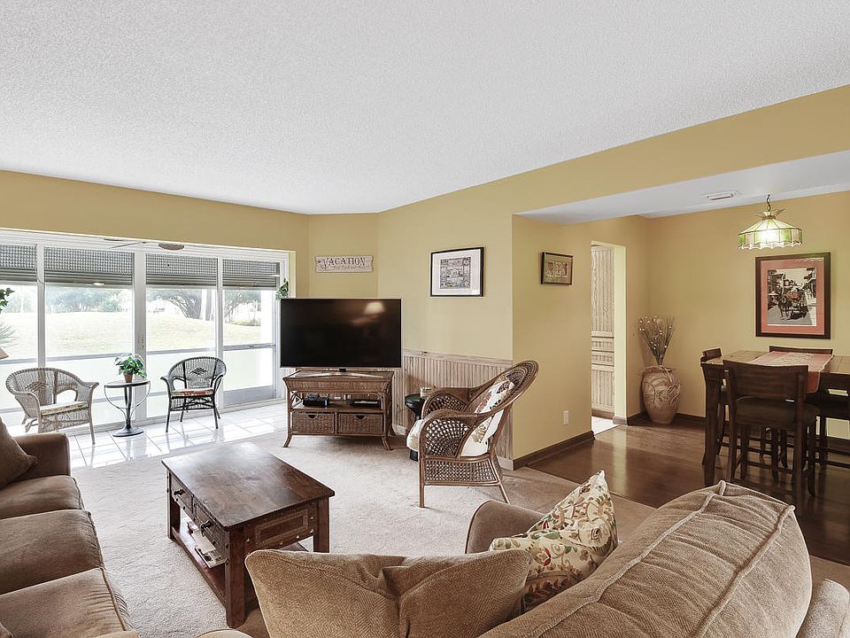 CONVENIENT 1ST FLOOR CONDO ON THE GOLF COURSE WITH DESIRABLE EASTERN EXPOSURES ON THE PATIO THAT OPENS INTO THE EAT-IN KITCHEN, LIVING ROOM & MASTER BEDROOM. GLASS SLIDERS ON THE PATIO KEEP IN THE VIEW AND KEEP OUT THE RAIN AND EXPAND THE LIVING AREA. NICELY FURNISHED, WITH UPDATED KITCHEN CABINETRY, STAINLESS APPLIANCES, WALK-IN SHOWERS IN BOTH BATHROOMS, UPDATED VANITIES,TILING IN SHOWER, FOYER & WAINSCOTING ON THE LIVING ROOM/DINING ROOM WALLS GIVE THIS A VERY CHARMING LOOK. THE RESORT STYLE POOL IS STEPS AWAY WITH WI-FI & LARGE COVERED CABANA AREA. THE LUSH LANDSCAPING IN BIRDIE CREATES A SPECIAL CHARM. THE CLUBHOUSE WITH ITS ADDITIONAL POOL, MEL'S BISTRO WITH ENTERTAINMENT & MANY CLUBHOUSE ACTIVITIES SUCH AS TENNIS, PAY-AS-YOU-PLAY GOLF, TRIPS, CLASSES, SHOWS MAKE THIS A SPECIAL HOME