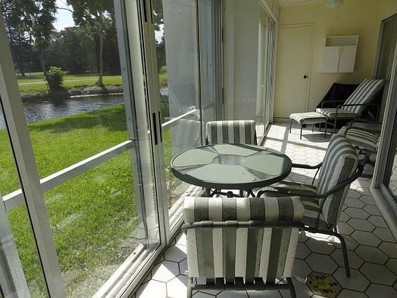 BEAUTIFUL WATER & GOLF COURSE VIEWS FROM A TILED PATIO WITH GLASS SLIDERS TO KEEP OUT  THE RAIN & KEEP IN THE VIEWS. DESIRABLE EASTERN EXPOSURE ON THE PATIO THAT OPENS INTO THE KITCHEN WITH ITS KITCHEN BAR,INTO LIVING RM, & MASTER BEDROOM WITH ITS 2 CLOSETS & ENSUITE BATHROOM WITH WALK-IN SHOWER.  METICULOUSLY MAINTAINED THIS CONDO IS ''MOVE-IN'' WITH FURNISHINGS AS SHOWN.THE BIRDIE DRIVE RESORT STYLE POOL IS CLOSEBY WITH ITS LARGE CABANA SITTING AREA, SHUFFLEBOARD, WI-FI SERVICE & WALK OVER PATH THROUGH THE GOLF COURSE TO THE POINCIANA CLUBHOUSE WITH ITS BISTRO/RESTAURANT, ADDITIONAL POOL, TENNIS, PAY-AS-YOU-PLAY GOLF, EXERCISE ROOM, LIBRARY, LECTURES, CLASSES, MOVIES, SHOWS IN SEASON & MORE!  A GREAT COMMUNITY WITH CONVENIENT LOCATION WITH EASY ACCESS TO THE TURNPIKE,SHOPPING,AIRPORT,+
