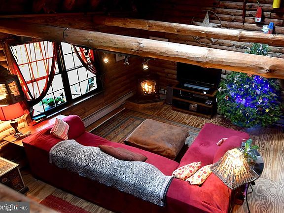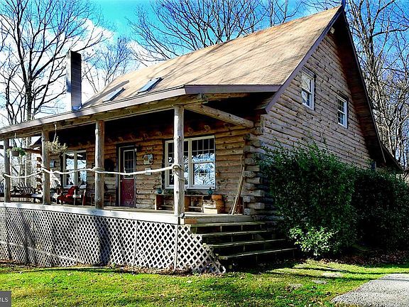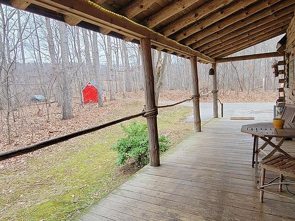 A log cottage or a log home? Shady Oak is a little of both - plenty spacious but retaining the quaintness of a hideaway cottage. The pine-log, Cape Cod home, completed in 1992, is tucked away on 14.7 wooded acres and features 3 bedrooms, 2 full baths (each with shower/tubs), full basement at ground level, plus 40'x 8' both front and rear covered porches. A second-floor open loft area overlooks the ceiling-vaulted, first floor "great room," complete with skylights and a cozy gas log stove. Interior: The first floor features the primary bedroom (with bath and double closets) which overlooks the front porch, lawn and garden. The kitchen features a large island and plenty of cabinet and counter space. The living room and dining room offer an airy space with an open floor plan. Upstairs are the loft, another full bath (with skylight) and two bedrooms. One bedroom features a unique, second-level "loft" within the bedroom, to utilize the space created by the roof slope. The first and second floor offer over 1,834 square-feet of living space. The basement adds another 1,000 of finishable space. Acreage: An acre of lawn surrounds the home giving just enough space to breathe among the hardwoods. Take a walk along the several trails through the mature forest, with oak, maple, and an abundance of spectacular tulip poplars (most well over 100 feet tall). Two tame creeks cut through the woods on either side of the property and converge near the southern border of the land. Several spots offer vistas and areas to sit or camp. The paved, 1/2 mile driveway cuts through the woods and culminates at the home with three paved parking spaces. The house is situated on a peak between the property's two valleys. Drainage is not an issue. There are flat areas surrounding the home which could be used for outbuildings or expansion. Appliances: The clothes washer/dryer and hot water heater are under five years old with newly replaced copper piping at the connections. Refrigerator in three years old and supplemental freezer is included. PVC piping is used for water supply (well) and sewage (drainage). Heat is baseboard hot water powered by an oil boiler. A 100-gallon propane (LP) tank feeds the kitchen stove, gas log fireplace, and an integrated generator (Genrac) which provides power to the home's main systems in case of outage. Television and internet access is provided via satellite.