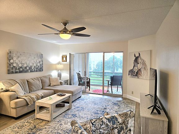 This is the one! This bright condo has both water & golf views from the screened & enclosed east facing balcony! It can be opened up all the way to let the fresh air in or enclosed under air for additional living space; the best of both worlds! The bedroom also has balcony access & views of the water & fountain. It has been updated with fresh neutral paint with new beautiful wood floors throughout! The home also features newer stainless steel appliances & the AC is newer as well from 2019! The bedroom also has two walk-in closets & an on-suite bathroom & there is a separate half bath that guests can use! The community offers a pool with a cabana & there is easy access to the clubhouse with an additional pool, tennis, pickleball, golf, gym, restaurant, entertainment with movies and games, a library & more! This desirable 55 and over community, where only one person has to be living in the home full time that is 55 or over, is just minutes to the beaches, shopping, entertainment & the airport. The maintenance fee also includes cable with HBO, internet, water, pest control, exterior maintenance/insurance for the building & common areas & all of the amenities listed above! Come take a look & don't miss the added details of the upgraded tall baseboards & the flat textured ceilings making this home move-in ready! Better yet, all of the furniture & art is included, making moving in a breeze! This is the perfect condo & community to make your own special home or your second getaway home!