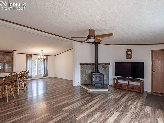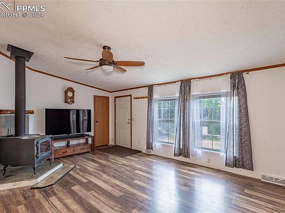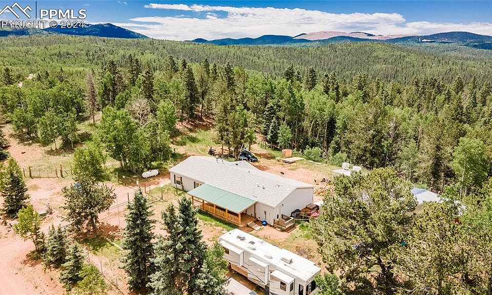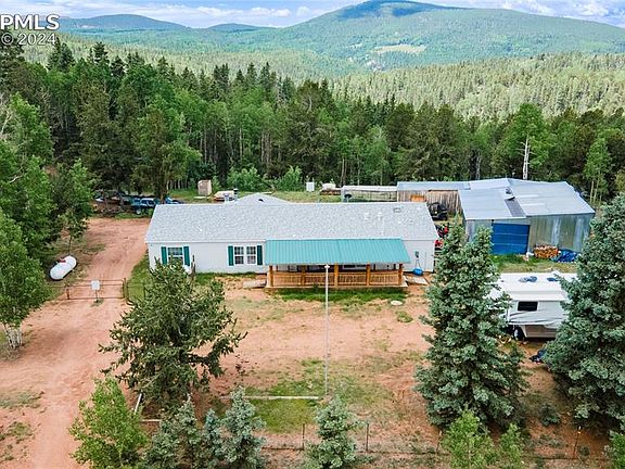 Welcome home to Colorado mountain living. Ranch floor plan manufactured home on over 5 gorgeous acres bordered by BLM Land! New furnace! New Hot Water Heater, New radon mitigation system! Plenty of room to ride your horses and hike until your hearts content with access to amazing BLM land. Everything you love living in the Colorado mountains for is right here; hiking, horseback riding, hunting, wildlife, and peaceful, private, quiet mountain living. Home features an open floor plan, with spacious rooms, walk in pantry, skylights and counter bar with stools. Great room with open living room, kitchen and dining room. The 4th bedroom bonus room could be office space or a craft room. New washer and dryer. Chicken coop/dog kennel, a barn and shop, 50 Amp for RV, hot and cold outdoor water, porch swing and a flag pole add to the amenities. The shop has electric and a wood stove! So many possibilities here, spacious home on hard to find acreage with no HOAs or covenants to make your own! Close to great fishing, Dome Rock, Mueller State Park, mountain bike and hiking trails and Cripple Creek. Make this mountain living property your own with some finishing touches.