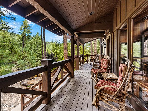 Nestled among the majestic ponderosa pines of Prescott, this mountain haven blends natural beauty with meticulous craftsmanship. Set against the backdrop of breathtaking rock formations and mature landscaping, this stunning retreat has undergone a remarkable transformation, showcasing an unparalleled attention to detail. Step inside and be greeted by the awe-inspiring great room, where a cantilevered tongue and groove vaulted ceiling commands attention, elegantly framed by a stone-surround fireplace that exudes grandeur. The kitchen, a dream come true for any culinary enthusiast, boasts Swanstone countertops, two-tone cabinets, knotty alder island with bar seating complemented by a bar sink and wine fridge for effortless entertaining. The induction range promises culinary perfection,