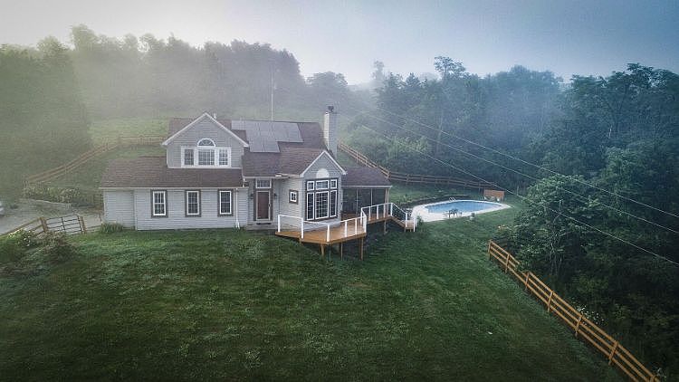 **OPEN HOUSE IS CANCELED**Welcome to your own piece of paradise. This home features amazing views from your chalet style home. With over 10 acres, an inground pool, a large screened porch and wrap around deck, you'll never want to leave. The home features 3 bedrooms and 3 full baths all recently updated. Bedrooms and one bath have been updated with hardwood. The kitchen has been remodeled with quartzite countertops, the basement is finished with a walkout. The barn is perfect for all of your toys and even a couple of horses. The attached garage has been extended for an oversized truck. Wash the dogs in their own doggie wash located in the 1st floor laundry. There is an outdoor generator hookup, one propane and one wood-burning furnace, outdoor speakers and a wood burning fireplace. A section of the land has been fenced to create a backyard space. Solar Panels will be removed prior to closing. Cistern is on a whole house filtration system.