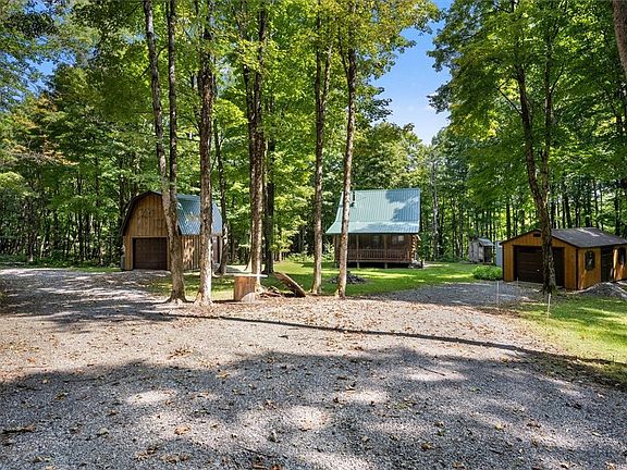 Tug Hill Log Cabin-Looking for the perfect getaway? Located on Corridor 7B, bordering NYS land, this is a snowmobile/ATV/hunting enthusiast's dream! Sitting on 7.4 acres, with the White River bordering the property, this off grid 1 bedroom 1 bathroom Lok-N-Log cabin is turn key and sleeps 6 comfortably. Open concept living room, kitchen and dining area, and a full bathroom all on the first floor. Spiral staircase up to the loft sleeping area w/ king Sleep Number bed, another single bed, and a closet. The entire home is equipped with propane lights, and wired for electric. Utilize the generator with the push of one button for all the comforts of home! Never run out with a 1000 gallon propane tank, and back up solar for the on demand hot water heater. Take in nature sitting on open back and front porches! 40X9 shipping container for storage or workshop, 14X28 and 12X16 garages, both with heat and electric, circular driveway, double generators in enclosed shed, full insulation in floor and ceiling, dug well, septic, and so much more. Rock walls, sloping lawn, and a canvas of green will make you want to stay here forever! Snowmobiles, ATV negotiable with sale.