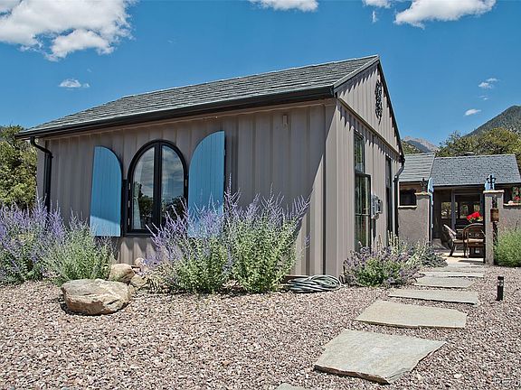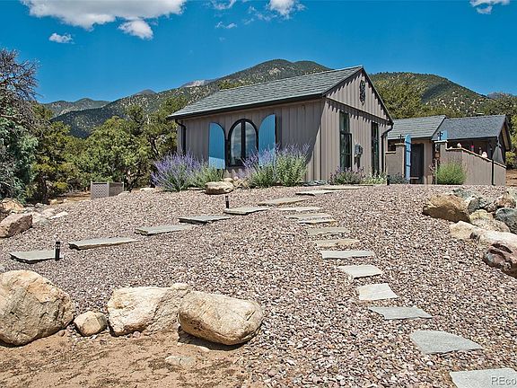 Exquisite, immaculately maintained 1 bed/1bath 950 sq ft home sits on a private cul de sac with 2.96 acres of natural beauty. This charming home offers lovely landscaping with perennials, natural rock outcroppings, juniper and pinon pines . With an open floor plan and recycled hardwood flooring, the home gracefully flows from the living room through the kitchen out into a gorgeous patio with a stucco wall, flagstones, and a lovely screened in portion with an artistic local-rock wall and a wood burning fireplace: perfect for entertaining! The rock wall even offers fluorite gemstones from the local mountains. There is a wood burning fireplace gracefully set at the end for ambiance and the comfort for 3 seasons. From the flagstone patio, stairs lead to a roof deck featuring tremendous views of the Sangre de Cristo Mountains and the San Luis Valley: imagine brilliant sunsets and dark starry skies. French doors open to the patio from the bedroom, the kitchen, or the living room making it feel part of the living space. The kitchen offers subway tile, a crystal chandelier, recycled hardwood flooring, concrete counters and newer stainless appliances. On the east end doors open to a 3/4 bath and the primary bedroom with a walk in closet. A mantled propane fireplace in the living room along with two electric ETS heaters offers winter warmth. The 5 parcels are currently in process of being consolidated into 1 to reduce POA and Baca Water fees. Some furniture is negotiable: please ask for details. This steel and rock cottage offers fire protection along with its mitigation. The nearby parks, greenbelt trails and spiritual centers are readily available making this a perfect secluded primary, rental, or retreat home. While nestled on its own cul de sac, the town of Crestone is only 10 minutes away and boasts restaurants, an art gallery, gas, post-office, hardware, liquor and grocery stores. Come see this special home!