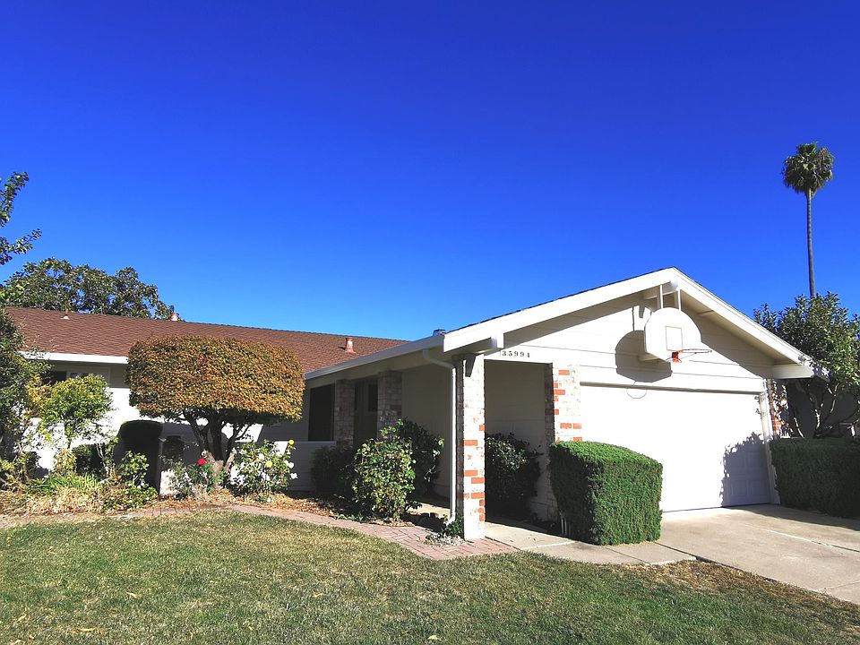 An updated single-level Ranch style home with a brand new exterior and interior paint job. It has 3 bedrooms and 2 bathrooms, along with a stunning hardwood floor throughout the whole house. This home offers a formal living room and a separate family room, with an open floor plan around the kitchen and dining area. The home is located in a super desirable quiet Brookvale neighborhood. It's only a short drive to Interstate 880 and Highway 84 (Dumbarton Bridge to the peninsula) with easy access to Facebook, Tesla, and the rest of Silicon Valley. It is 9 miles from Facebook MPK, with a Facebook shuttle stop only five minutes of walking away. It is also close to Union City and Fremont BART stations. Lucky's, CVS, Starbucks, Centerville Library, and 24 Hour Fitness are also close by. The house is minutes from Trader Joe's, Sprouts and Whole Foods. There are also many hiking and biking trails near the house, including Quarry Lake and Alameda Creek. The home is within walking distance to the award winning American High and very close to other great schools such as Brookvale elementary school and Thornton Junior High School. All three schools are great schools rated 9/10. The house offers a nice kitchen with granite countertops, a dishwasher, an electrical stove and recently refinished maple cabinets. It also has: -Spacious master bedroom with walk-in closets -Copper plumbing and dual pane windows -In unit washer and dryer in laundry room with plenty of shelves and storage -Attached 2 car garage with extra storage -Well kept front and back lawns with mature landcaping, flowers, and fruit trees.