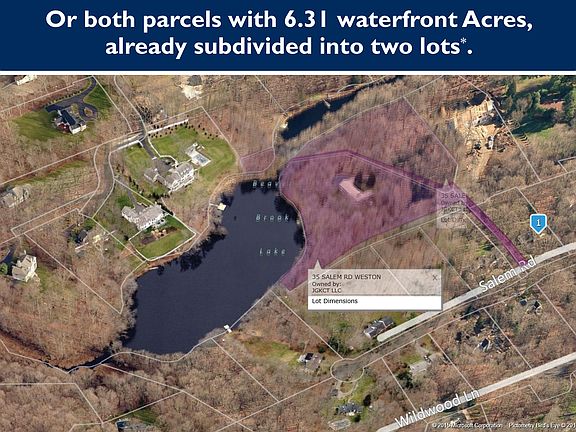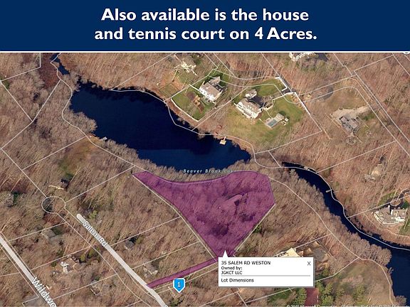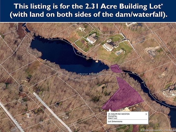 For more pics and info, visit 35Salem.c0m or for similar listings, visit ryancornell.c0m. Waterfront Building Lot(s) on cul-de-sac, in Lower Weston. This listing is for the 2.31 Acre Building Lot* (with land on both sides of the dam/waterfall). Also available is the house and tennis court on 4 Acres (which could be a Building Lot). Or both parcels with 6.31 waterfront Acres, already subdivided into two lots*. Long, private drive, and deer fencing. Surrounded by luxury homes. Located in the center of town, nearby Weston's top-ranked schools. *Ask for details about installing new driveway.Also listed as house and tennis court on 4 Acres or everything combined on 6.31 Acres.