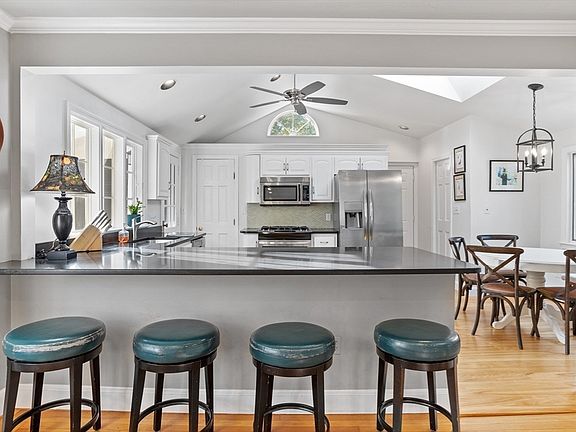 Elegantly situated on a beautifully landscaped lot adorned with vibrant flower and vegetable gardens, as well as generous outdoor space for recreation and leisure. The home blends timeless architectural charm with the comforts of modern living.The living room exudes warmth, featuring a striking fireplace, vaulted and beamed ceilings, and refined crown molding that together create an atmosphere of classic sophistication. The thoughtfully designed kitchen is ideal for both culinary pursuits and social gatherings, boasting a peninsula and a sunny eat-in dining area. Skylights invite an abundance of natural light.A family room opens gracefully to the deck and patio, offering picturesque views of the private rear yard and surrounding landscape, perfect for indoor-outdoor living. The main-level primary bedroom provides both comfort and convenience.Located blocks from Lexington Center, this home enjoys close proximity to local amenities, conservation land, and Rte. 95
