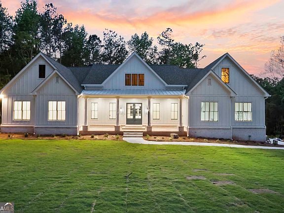 Stunning 2025 Modern Farmhouse build just 2 miles from the city limits of Monroe, Georgia. This beautifully crafted ranch home blends contemporary finishes with a farmhouse feel in a peaceful, rural setting. Set on a spacious 2 acre lot and framed by mature trees, this light filled home makes an unforgettable first impression with its crisp white exterior, gabled roof lines, and inviting porches. Generous windows flood the home with natural light, highlighting clean lines, quality craftsmanship, and a neutral palette ready for your personal touch. The open concept is designed for both everyday living and effortless entertaining. There's a seamless flow between living spaces inside and out creating a perfect atmosphere with two fireplaces, one in the great room and a second on the exterior rear deck. A grand double door entry, formal foyer, designated office and great room with gourmet kitchen create the lifestyle for present day living. The favored split bedroom floor plan positions the master suite on one side of the home with large laundry room close by and four bedrooms on the other side of the home, three of which have en-suites. A bonus room above the garage can serve as a 6th bedroom/ flex space and has a full bath. This stunning ranch checks every box by including an unfinished daylight basement with endless possibilities. Come home to harmony that is 36 Alcovy Springs Drive.