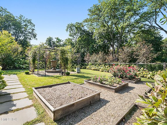 The property is surrounded by beautifully landscaped gardens, highlighted by hydrangeas and ornamental grasses. An enclosed vegetable and flower-cutting garden with a central fountain creates a peaceful, private escape and a charming focal point for the grounds. Designed to provide color and texture in every season, the landscape offers both beauty and seclusion. At the heart of the outdoor setting, a heated, salt-water pool and spa are framed by sweeping lawns, classic stone walls, and mature plantings, completing this serene retreat.