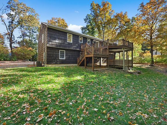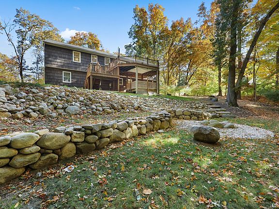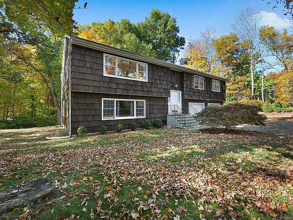 Nestled in a serene woodland setting, surrounded by charming old stone walls, this inviting home offers modern comfort with a newer roof, air conditioning, and a Nest system. Step through the sunlit two-story foyer into spacious living and dining areas, freshly painted interior, featuring hardwood floors and abundant natural light from multiple windows. The updated kitchen boasts quartz countertops, a breakfast bar, a farmhouse sink, and stainless steel appliances, flowing seamlessly onto a generous deck w/ string lighting overlooking the terraced yard complete with a fire pit and outdoor hot tub. The main level includes a primary suite with a newly refreshed en-suite bath, plus two additional bedrooms and a second full bath also just refreshed. On the lower level, you'll find a large family room with a cozy wood stove, a bar with a beverage refrigerator, a fourth bedroom, a full bath, and a laundry room. This level also provides access to the sizable two-car garage. Conveniently located just minutes from I-95, the Merritt Parkway, schools, and local amenities, this property offers the perfect balance of tranquility and accessibility for an easy commute.