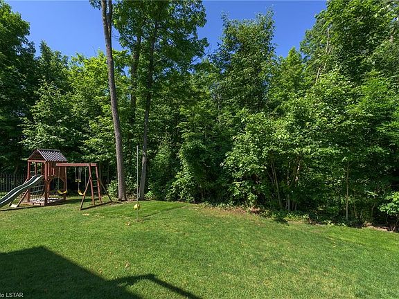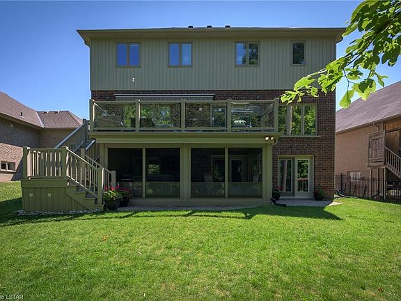Beautiful two-storey home, with a walkout basement, on a quiet, friendly street, just minutes north of London! The fully landscaped front yard and concrete drive, welcome you. The 9' ceilings, bright foyer, oversized dining room, office or playroom with a view and open concept living room and kitchen with hardwood and crown mouldings throughout, will impress you. Step out to the 240 sq ft Weatherdeck deck with glass rails and electric awning, and enjoy the incredible private views of the municipal woods. Upstairs offers 4 spacious bedrooms, including a Master suite, with two walk-in closets. One is 10.6'x10.6', and the other one, off the ensuite, is 10.6' x 7'! The other bedrooms are all well-sized, with a bathroom and laundry. The lower level, offers an open rec room, bathroom and lots of storage. You can also walk out and enjoy the incredible 3 seasons screen in sunroom. Enjoy being close to nature! Don't miss the garage before you leave! A two car plus one tandem space, which is great for loads of storage! Get ready to enjoy your new home!