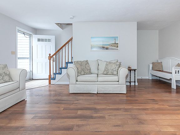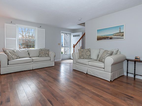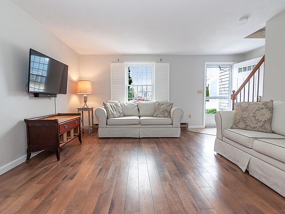 Extremely rare 3 bedroom, 1.5 bathroom private end unit townhouse in the exclusive East Sandwich Fox Meadow Association. This turn-key home offers a new refrigerator in the versatile kitchen and pantry along with a pass through serving window and counters. In addition it provides an inviting and open concept dining/living room area with updated Pergo flooring, closet space, half bath and first floor laundry. The second floor features three bedrooms with ample and generous closet space and wall to wall carpeting, full bath with tub and a large pull down attic storage area. The convenient back patio from the kitchen allows for grilling or just admiring the abutting acres of bucolic conservation woodlands. Other features include mini splits throughout, parking for 2 cars and pets allowed. The quiet neighborhood offers easy access to highway, beaches, golf, restaurants, schools and shopping in historic Sandwich Village.