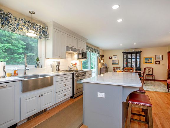 Set privately at the quiet end of the street, this wonderful Meadowbrook home offers features and amenities for every member of the family. Large, custom built, expanded Cape features an impressive center island kitchen with gas range and hard wood. Dining area with hard wood and slider to the private rear sundeck. Family room/formal dining room with hard wood. Spacious living room with hard wood & two-sided wood burning fireplace. Fabulous first floor primary bedroom suite with abundant closet space, hard wood, marble and quartz. Upstairs are three comfortable bedrooms, a full bath with tile and marble, a large attic storage area and more. Town water & sewer. Heat pump with 6 mini-splits for energy efficient heating and cooling. Natural gas fired HWBB heat, cook stove and whole house generator. Added insulation when all new vinyl siding and replacement windows were installed. A dream come true - near trails to The Town Commons and Bowdoin College and close to all things Brunswick.