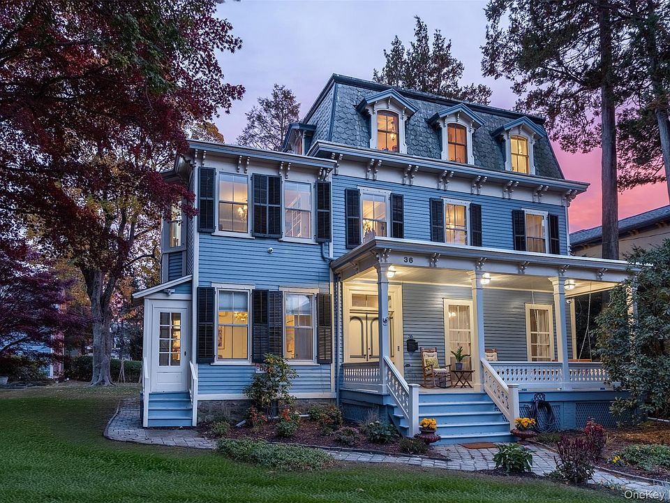 Unwind on an idyllic rocking-chair front porch at this distinguished 6-BR, 3500-sf Mansard Victorian, located on Belden Avenue - the only designated historic neighborhood in Dobbs Ferry. Sitting on a lovely level .35-acre property, the home is just steps away from Ardsley’s fairway green and a short walk to the Village’s schools, parks, swimming pool, and lively downtown. Painstakingly renovated in 2022, it received upgraded mechanicals, electricals, plumbing, and interior finishes, while successfully retaining its characteristic turn-of-century charm. Slate roof shingles, double bracket eave detail, and decorative balustrades are just some of the preserved hallmarks of the home’s striking architectural style. Inside, elevated 10-ft ceilings, hardwood floors, ceiling medallions, and period moldings contribute further to the home’s elegance and beauty. A stately living room offers exquisite 7.5-ft-tall double-hung windows, deep western window bay, and wood-burning fireplace. The formal dining room includes wainscoted walls, with views towards the azalea and vegetable gardens. Southern light floods into a lovely, renovated kitchen offering quartz counters and stainless appliances. Large windows at the sink provide an aperture onto the picturesque backyard, and a nearby door provides direct access to rear porch and yard beyond, fenced in on 3 sides. A gracious family room/first floor bedroom, illuminated by bay windows, can easily accommodate an elegant home office, with a separate entry from the street, and a beautiful renovated bath. The hall stair curves its way to a second level offering 3 distinctive bedrooms, all with 9-ft ceilings and hardwood floors. One features bay windows and cedar closets, while the primary is cheerful and expansive, overlooking the beautiful Belden streetscape. A sizable, renovated bath and versatile laundry room on this floor are both awash in sunlight. Ascend to find 3 additional bedrooms on the 3rd flr with large, gently arched windows framing bright sky views. Here, a voluminous bath bathed in sunlight features a claw-foot tub, oversized step in shower, custom cabinetry, and a convenient second sink area. In the backyard, edged by a private service lane at the far side, discover an attractive 2-car garage/barn with a 2nd flr that provides creative possibilities. With the Aqueduct Trail and Juhring Nature Preserve nearby, enjoy all that Dobbs Ferry has to offer while living in style.
