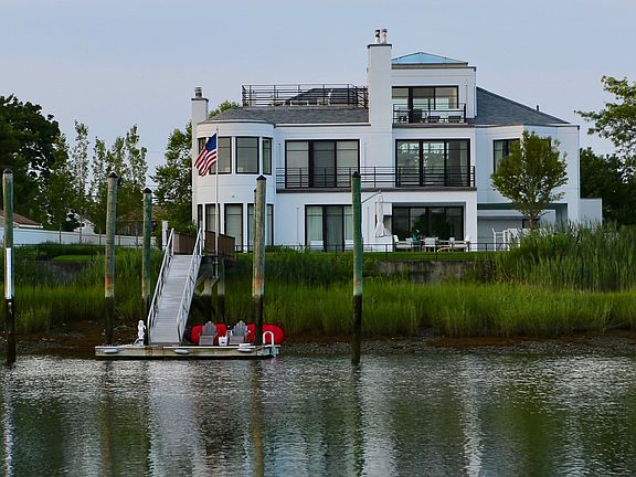 Scintillating, Sensational and Spectacular! There is not another like this in all of Westport: an elegant custom three story direct waterfront contemporary with a deep water dock and pool, sited on a beautiful half acre with three car garages, outdoor kitchen, multiple roof top decks and additional outdoor entertaining spaces all directly on the sunlit lagoon, with full Southern exposure. Master European craftsman have fashioned this meticulous modern with custom floors, built-ins, moldings and floating glass stairways that climb to the stars. Light pours in through all the walls of glass reflecting the sun and sea, and invite you into a singular environment of glamour. A dazzling 4 beds, 4 baths elevator ready home. Move in with nothing to do. Simply...sensational.
