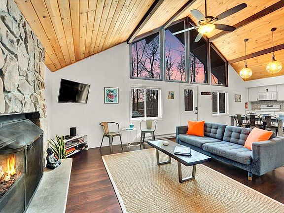 UNDER CONTRACT SHOWING FOR BACK UP OFFERS ONLY. Your chance to own The Black Chalet in Lake Harmony Estates! This Modern 3-Bed, 2-bath CHALET IS located in a PRESTIGIOUS AREA of the Pocono Mountains nestled on the edge of thousands of wooded acres. This SUCCESSFUL, HIGH-PERFORMANCE, TURNKEY SHORT-TERM RENTAL is being sold with all furnishing included. The property offers the perfect blend of NATURE'S TRANQUILITY and contemporary luxury, ensuring a PERFECT GETAWAY. Unwind UNDER THE STARS while surrounded by the forest, in a HOT TUB on the deck along with a fire table. Enjoy OPEN CONCEPT LIVING that seamlessly blends the indoors with the outdoors through large windows that frame BREATHTAKING VIEWS OF NATURE. The interior features KNOTTY PINE ACCENTS , VAULTED CEILINGS And EXPOSED BEAMS. Below the deck, unwind in the HAMMOCK OR gather around the FIREPIT in the back yard. The location is full of outdoor ADVENTURES, RESTAURANTS and BARS to enjoy all year. Walk to the enchanting Lake Harmony waterfront in 8 minutes. Owners and guests will have access to a 125-ACRE LAKE , A PRIVATE BEACH, TENNIS COURT AND GOLF CART FRIENDLY COMMUNITY. MOTOR BOATS PERMITTED. An INVESTMENT and PEACEFUL ESCAPE all in one!
