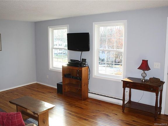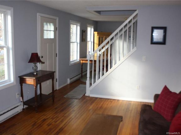 Pristine 3 Bedroom Cape with new windows, new exterior paint and new upstairs carpet. Bedroom on first floor and full bath with tub/shower on first floor. Formal dining room. 2 bedrooms up with new carpeting and cedar closet plus location for 2nd bath framed with tile floor in or use as additional storage. White kitchen with Dishwasher, Microwave and Fridge and Electric Range and door to backyard. Wood floors on main level. Wood stove was professionally installed in 2010 and property comes with 2 racks of seasoned firewood. Roof reported new in 2004. Unique rear yard with large shed on upper level with direct access to Peters Memorial Woods, a 56 acre plot with 6 marked trails for hiking, a Clinton Land Conservation Trust Property.