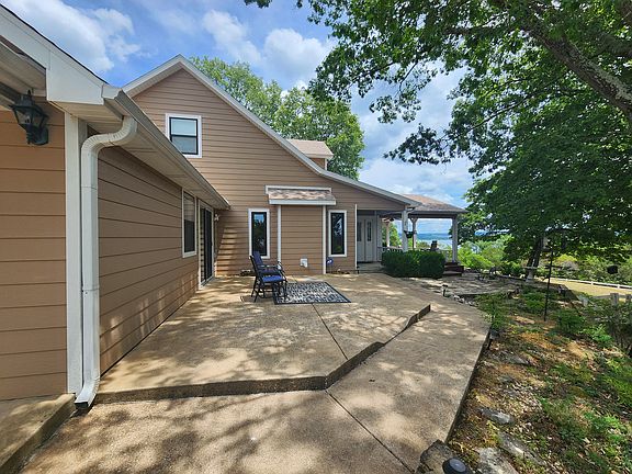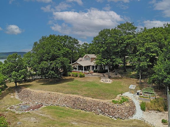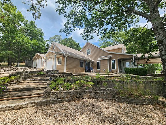 This is a rare opportunity to find a 1.6 acre estate with a Table Rock Lake View, 3 car garage, and available 10x24 Boat Slip for additional funds. This home features updated siding and roof. Enjoy lake vistas from your covered front veranda and several windows in the home. The living room is accented with warm hued colors, vaulted ceiling, and a pellet stove for cool summer nights. The kitchen features granite counters and Samsung stainless appliances. The main level floorplan has a formal dining room, a breakfast area, kitchen, master suite,, hall bath, sunroom, and laundry room which means no stairs for your primary living. The upper level features a sitting room with water view, 2 bedrooms, and a bath. And if you are looking for a shop, this offering features a double car garage with all kinds of area for a shop plus a single car garage for the family car. There is also an additional small garage for lawn equipment and the owner has set up a rain water collection system to water the garden area. The boat slip with lift is located in private community dock in Twin Island Estates and there is a Tritoon Boat that is available for sale with the slip.