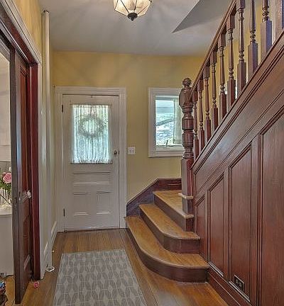 Graceful and historical colonial on 1.5 acres with covered porch and old world craftsmanship, including well maintained hardwood floors throughout, paneled staircase with bannister detail and more. A carved pocket door opens to the sun bathed family room. Beyond the entryway a country kitchen with shaker cabinets and newer appliances blends seamlessly with the outdoors, allowing access to the lovely deck from the kitchen, as well as the spacious dining area. Artful glass enclosed book shelves create a splendid library or dining room. A full spa like bath and laundry completes the first floor. Upstairs, a serene master bedroom is found, plus two more bedrooms and a full bath. A Third floor offers both a bedroom and lounge area. Charming stone wall basement. Information for a studio addition is available.