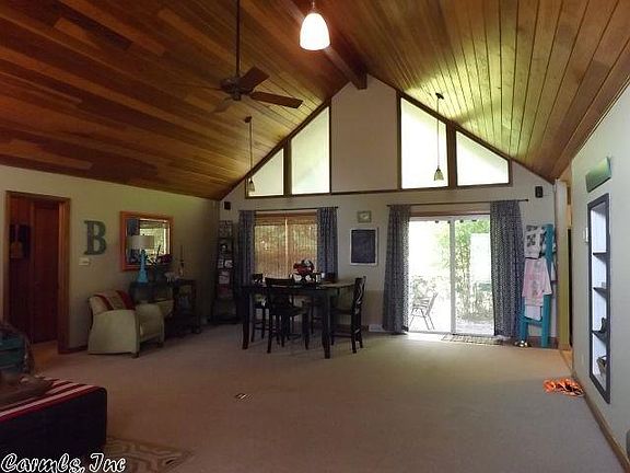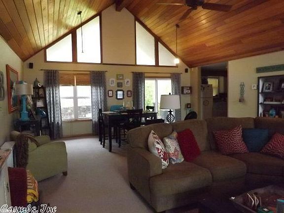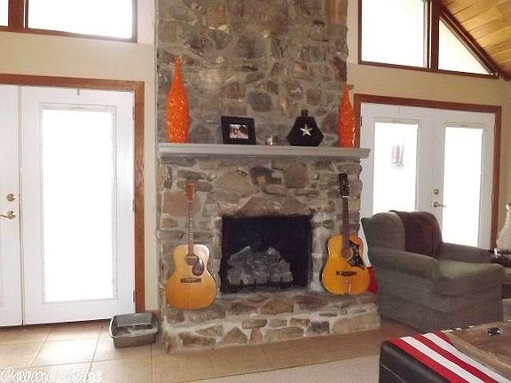 SEPARATED BEDROOM FLOOR PLAN SURROUNDED BY TREES AND PRIVACY! This home is a wow with 3 BR, 2 full baths, large open living/dining room with wood vaulted living room ceiling and beautiful native stone fireplace, all-electric heat & air, kitchen with large pantry room, drywall interior, wood siding exterior, 2006 architectural shingles, vinyl double pane windows, bamboo patio, large front deck, and attached workshop. Cherokee Village amenities include 7 lakes, 2 golf courses, parks, and more.