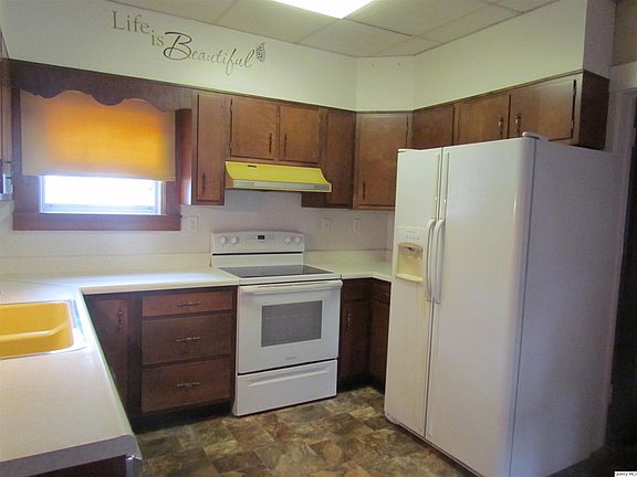 Single story home with 2 bedrooms, 1 1/2 baths, living room, kitchen with dining room, office, and den. Flooring consists of hardwood, vinyl, and carpet. Kitchen with wooden cabinetry with refrigerator and electric stove to convey. Partial unfinished basement. One car detached garage and carport with concrete drive.