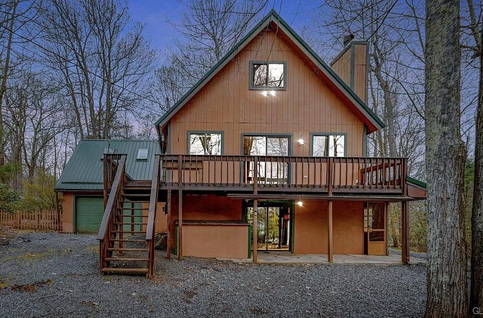 Expansive Pocono Contemporary Style Chalet Backing Up To Abundant & Lush Forestland! Offering 3 Bedrooms, 2 Full Baths, Propane & Wood-Burning Fireplaces, Hardwood & Tile Flooring, Beamed Cathedral Ceilings Plus New Skylights. Versatile Floor Plan Has Several Master Suite Options Each Providing Picturesque Views! Galley Style Kitchen w/ Abundant Cabinetry, Breakfast Bar & Open Concept Dining Area. Large Family Style Rec. Room Combo w/ Bar, Propane Heat & Stove Flue. Numerous Decks For Entertaining, Ample Parking & Oversized Garage w/ Bonus Storage Shed. PLUS New Metal Roof In 2021 w/ 40-Year Warranty. Community Benefits Include 9-Hole Executive Golf Course, Inground Swimming Pool, Clubhouse & More! Low Taxes Totaling Less Than $4,000/Year. Welcome To Your Year Round Countryside Get-Away!
