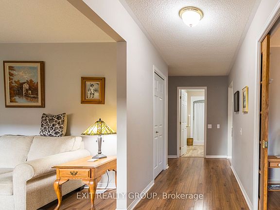 Laminate flooringU-shaped countertop kitchenNewer custom cabinetsLower patioNatural gas fireplaceSuperb ensuiteRaised vanity