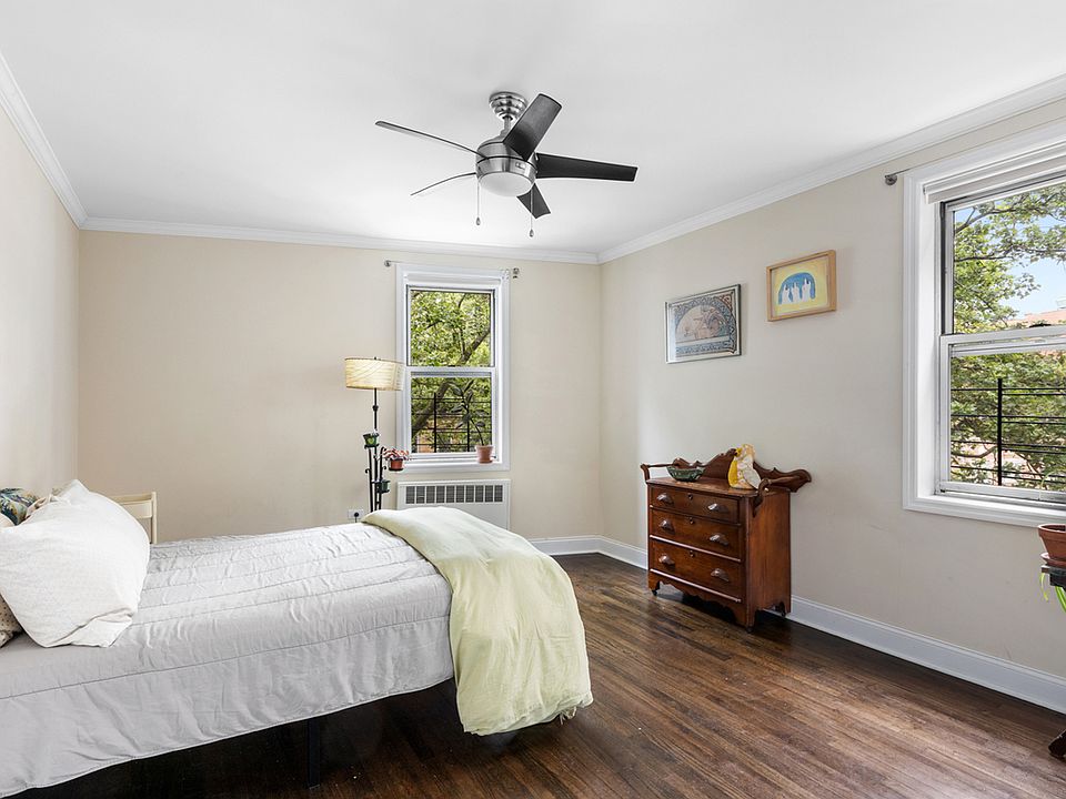 This bright and spacious corner apartment with beautiful hardwood floors throughout offers an expansive living room, dining area, large master bedroom, plus an extra room (currently used as a nursery) that can comfortably fit a twin bed. Upon entering, the hallway leads you to a large central room with walk-in entry closet and ample space for a dining table and chairs. There's a second closet just outside the living room, and a linen closet outside the bathroom. The oversized master bedroom, with double closets and overhead storage would comfortably fit a King. Both the kitchen (complete with stainless appliances) and bathroom were updated just a few years ago. This peaceful, light filled space is move-in ready. Dahill Gardens is an elevator building with laundry, parking, and extra storage. Located at the crossroads of Windsor Terrace and Kensington, and just one block away from the F/G trains at Church Avenue.