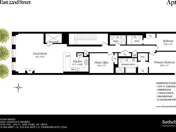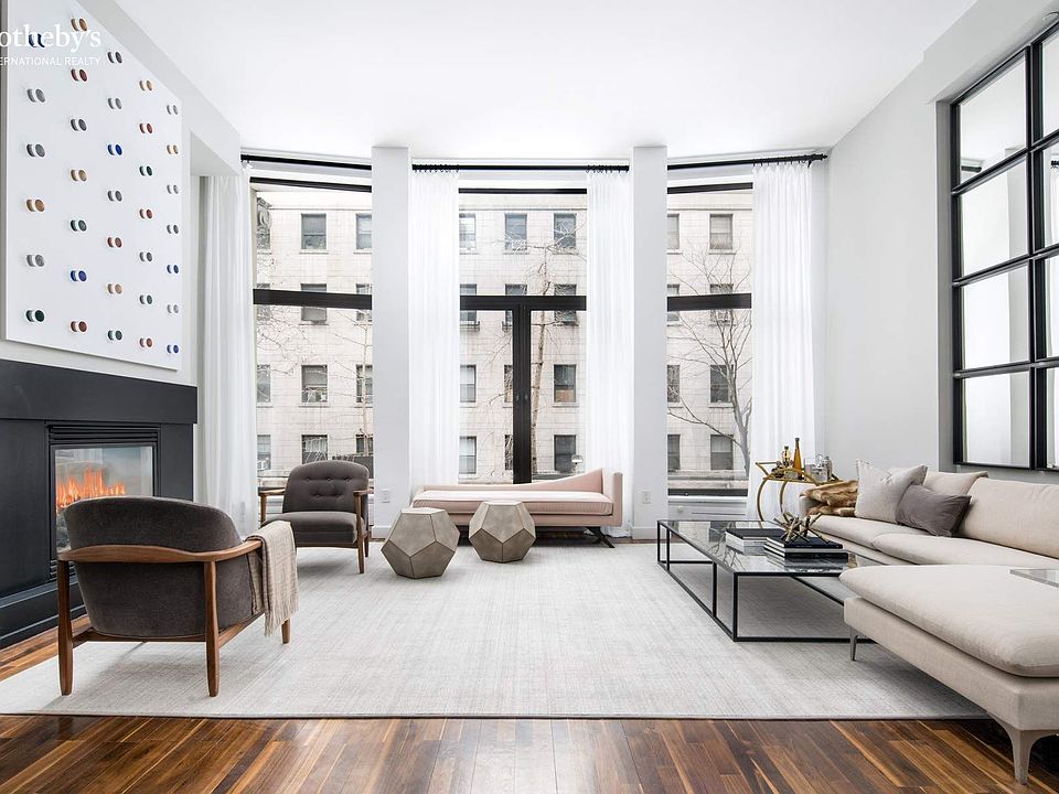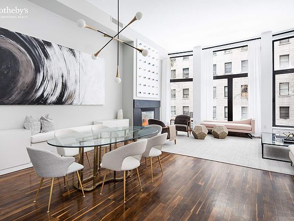 The wow factor begins at "hello" in this dramatic full floor, pre-war loft. With soaring 13 foot ceilings, a gas burning fireplace and a wall of windows facing Flatiron's most coveted block, this residence is situated just steps away from Madison Square Park. The keyed lock elevator opens directly into this sprawling 2-bedroom, 3-bath home with a home office that can easily function as guest room or den. Oversized casement windows adorn the living and dining room and perfectly frame the picturesque views of the quiet, tree-lined street. The chef's kitchen has superiorly designed cabinetry by Eggersmann as well as ample counterspace with top-of-the-line appliances including a Liebherr refrigerator, a Viking 6-burner stove, Miele dishwasher and a Liebherr wine cooler. In addition, there is extended counter-top dining for a more casual setting and further prep space. The tranquil primary suite is thoughtfully located away from the entertaining areas and faces south to a peaceful, green garden wall. Well-appointed walk-in closets provide smart storage and lead directly to the en-suite bathroom featuring an oversized soaking tub, separate shower and a dual vanity. There is another well-proportioned bedroom with en-suite bath as well as a home office and third full bathroom located just across the hall. Other prominent features include 5" Danish black oak flooring, an in-unit washer and dryer, custom lighting, multi-zoned central air, and Thermopane windows. The Story House is a boutique, 8-unit condominium building built circa 1901. It is aptly named not only for its luxury style, but for its perfectly distinguished loft-like characteristics and pre-war charm. Amenities include a 24-hour virtual doorman for monitoring package delivery, a supremely attentive super and a beautiful lobby.